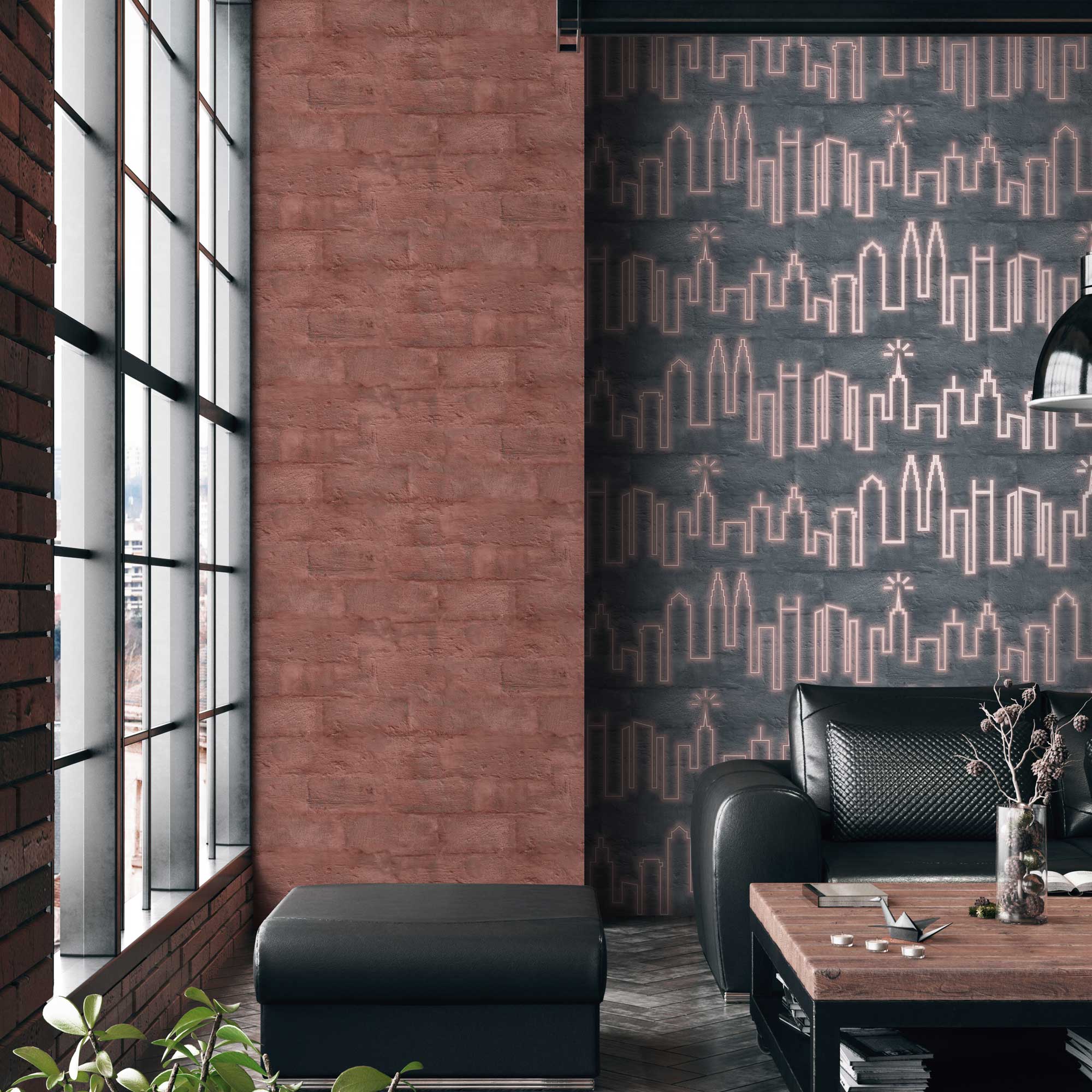 Featuring an artistic representation of iconic city skylines, this removable designer wallpaper captures the essence of urban life with a contemporary twist. The glowing neon outlines made of stamped metallic foil contrast beautifully against a textured brick wall background, creating a striking visual effect that evokes the vibrancy of a bustling city. Perfect for a feature wall in a living room, fun home office or bathroom, media room, gameroom, kidsroom, etc... this wallpaper adds a bold, sophisticated edge to any space. The subtle texture provides depth, while the sleek lines of the skyline offer a touch of minimalist elegance. Ideal for those who love cityscapes and want to bring a piece of that energy into their homes, this design is your gateway to a cosmopolitan ambiance, right within your own walls.